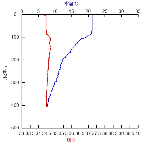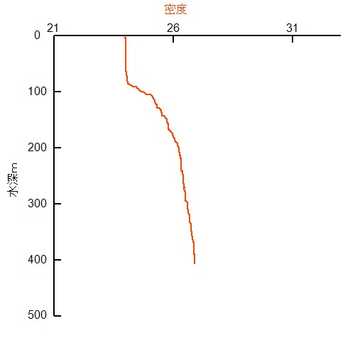 海洋観測の鉛直グラフ 2025年11月05日1121 測点st26 更新日時:2025年11月5日 12:35 水温・塩分鉛直グラフ 密度鉛直グラフ 観測日時:2025/11/05 11:21:00観測点名:st26観測場所:緯度 **-**.***、経度 ***-**.***